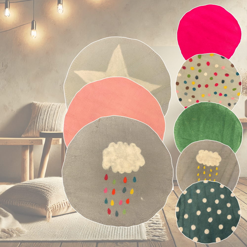 Håndlavede uldtæpper\nOplev skønheden i håndlavet kvalitet med vores bæredygtige uldtæpper fra Nepal. Perfekt til hygge og stil i alle hjemmets rum.\n\nDisse smukke tæpper, med en diameter på 100 cm, er håndlavet i Nepal af 100% ECO-Friendly certificeret