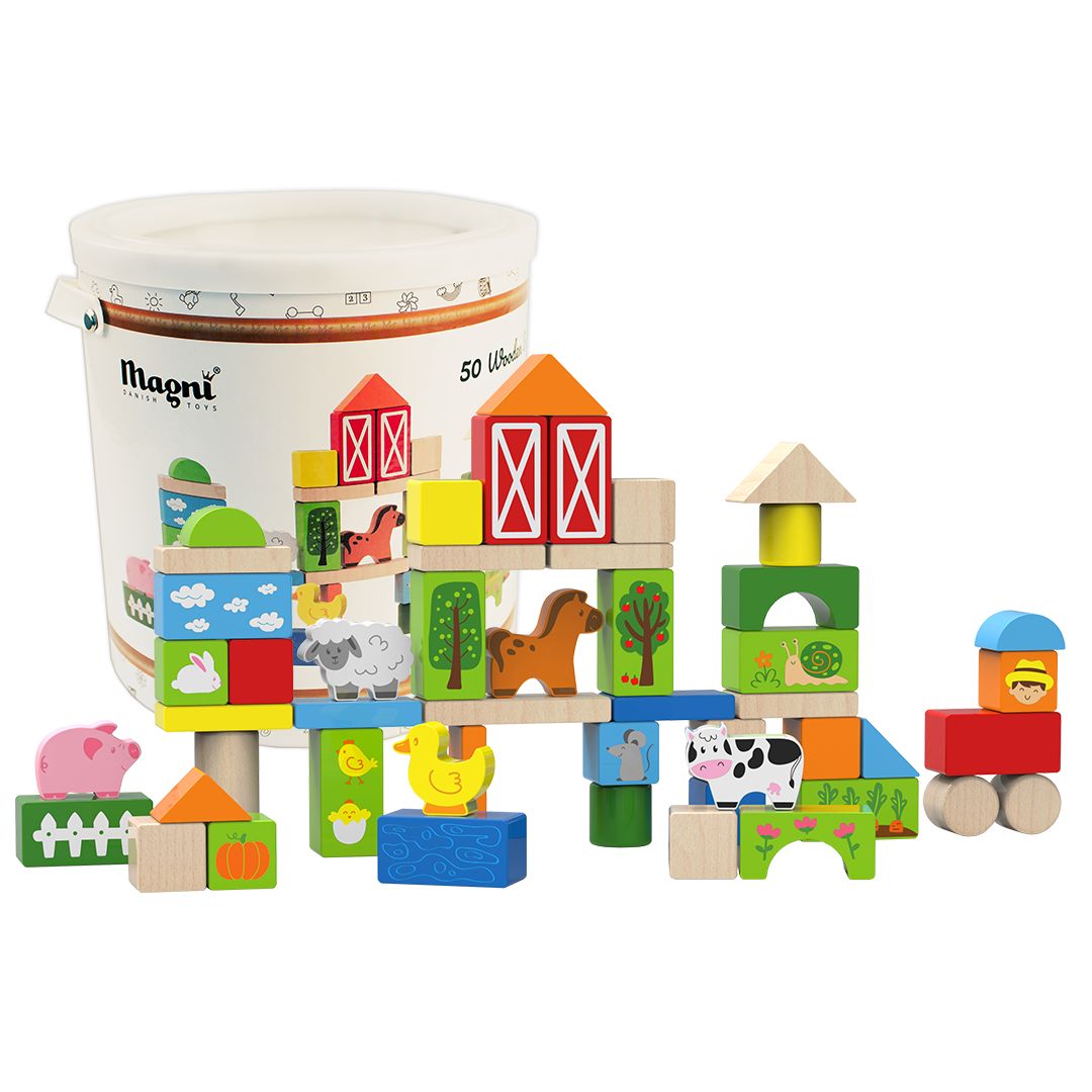 Magni - Klodser i opbevaringskasse - Bondegårdstema i stærke farver - 50 stk