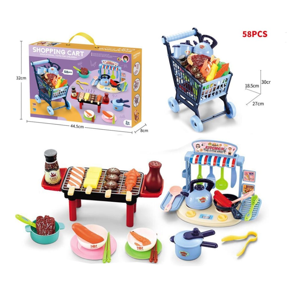 Indkøbsvogn, minikøkken og grill - Blå eller lyserød - 58 sjove dele -