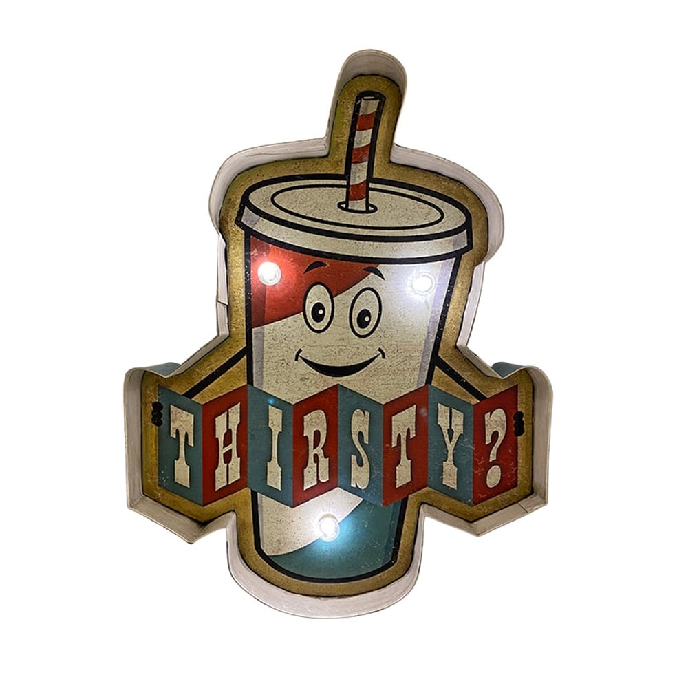 Retro Skilt THIRSTY med lys En ikonisk klassiker med LED pærer og tænd/sluk knap. Nem opsætning. Hvad end det er til værelset, stuen, køkkenet eller garagen - så passer vores metalskilte perfekt ind som en underholdende dekoration. Produkt informat