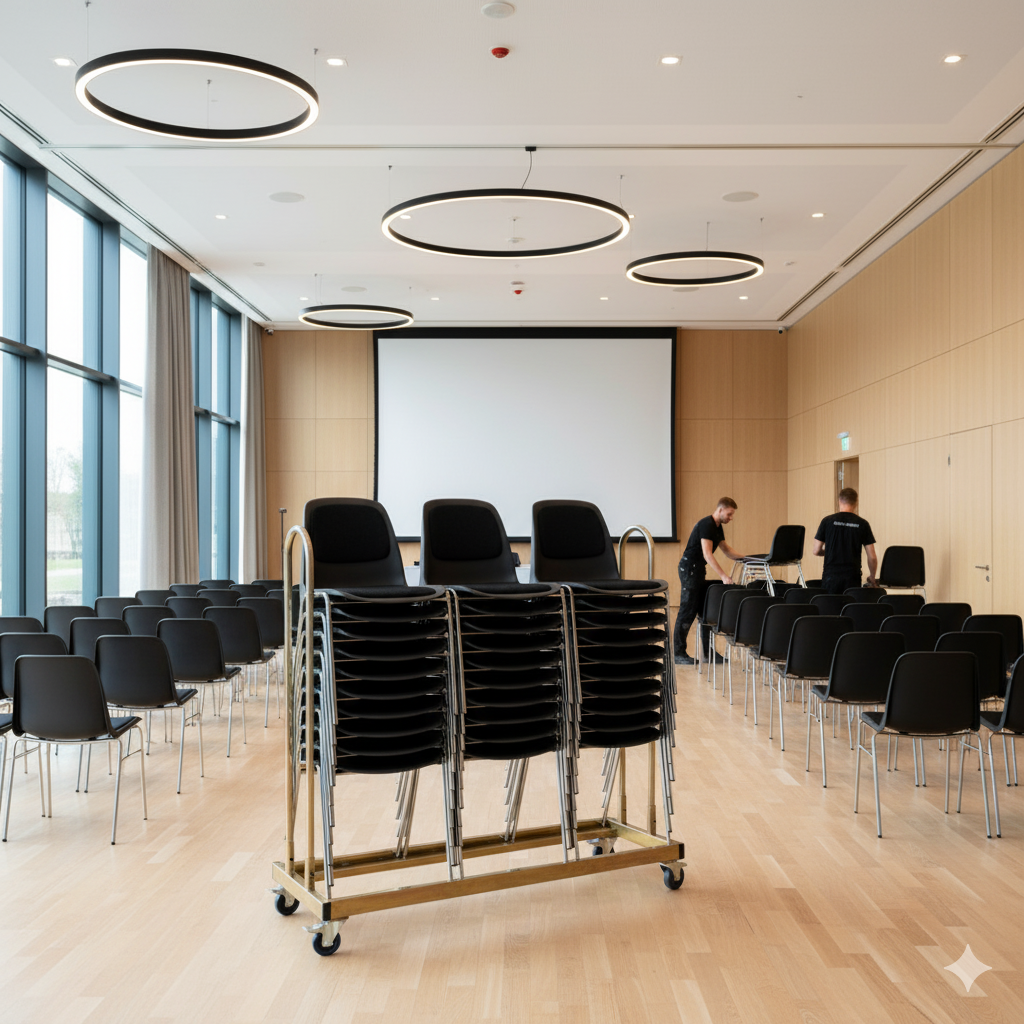 30 Bertram Stabelstol m/polster i sort inkl. stolevogn Komfort og praktisk opbevaring i ét sætOpgrader dine arrangementer med 30 Bertram stabelstole m/polster i sort inkl. stolevogn det perfekte valg til konferencer, mødelokaler, kantiner og events, hv