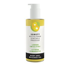 Sonett Krops & Massageolie citron og cembrafyr. - 145ml. - Økologisk krops- og massageolie med rytmiseret misteltenekstrakt, som aktiverer, afbalancerer og beskytter huden, samt forfriskende duft af citron og cembrafyr. Olien rystes godt før brug, så den samler sig til en nærmest cremet konsistens. Olien optages - Sonett Krops & Massageolie - Billig fragt og hurtig levering