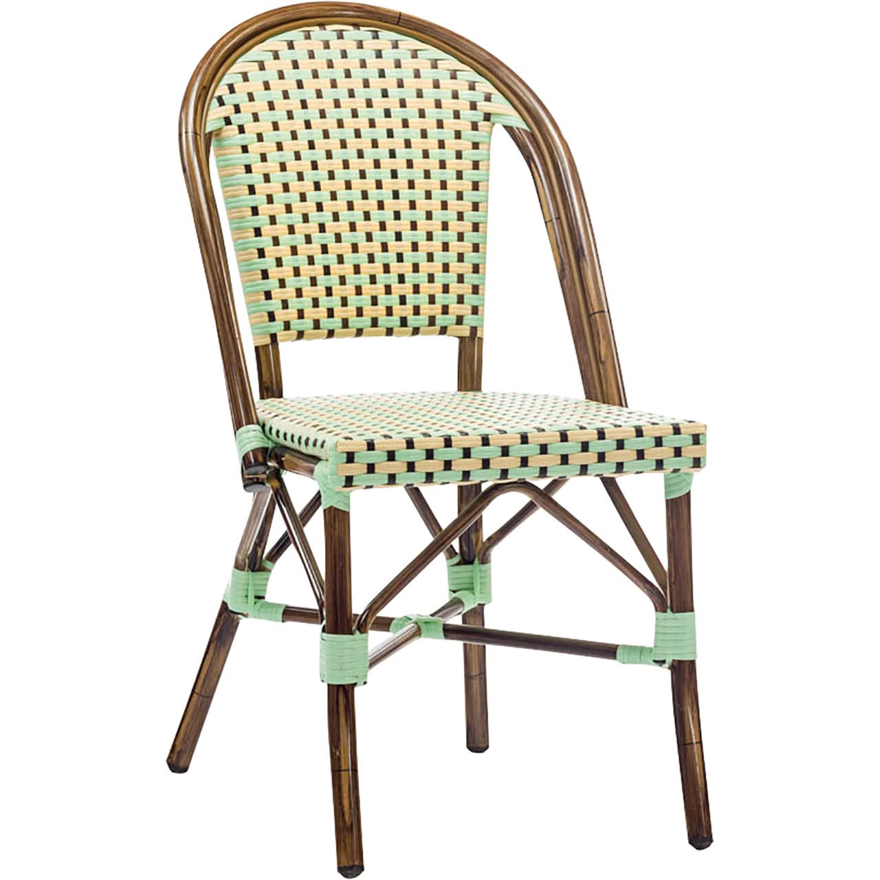 En klassisk cafestol, som leveres med beige/grøn/brun fletsæde understøttet med kraftige gjorde. Stellet er udført i kraftig aluminium i bambus look.Ellis stolen er perfekt til udendørsarealet på en restaurant, hotel, cafe, campingplads eller lignende, m