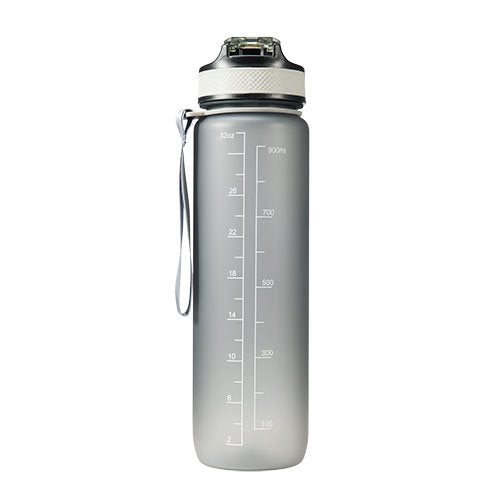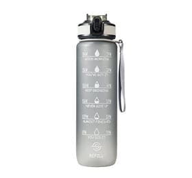 Motivationsflasken har en tidsmarkør, der viser, hvor meget vand der skal indtages i timen. Den øverste målelinje på flasken viser 32 oz, hvilket svarer til 946 ml. Men der er plads til lidt ekstra, så hvis flasken er fyldt helt op, rummer den cirka 1 lit